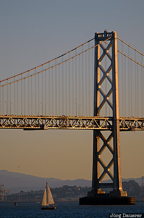 A tower of the San Francisco - Oakland Bay Bridge (also called Bay Bridge) connecting San Francisco and Oakland and a lone back-lit sailing boat illuminated by warm evening light seen from Treasure Island. The Bay Bridge is in California at the Pacific coast of the United States. This photo was taken in the evening of a sunny day in November of 2012. This photo was taken with a digital camera.